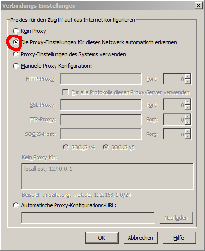 Wählen Sie "Extras -> Einstellungen". Klicken Sie auf das Icon "Erweitert" und dann auf den Karteireiter "Netzwerk". Unter "Verbindung" klicken Sie auf "Einstellungen...". Es öffnet sich ein Dialog "Verbindungs-Einstellungen" (siehe Screenshot): Wählen Sie "Die Proxy-Einstellungen für dieses Netzwerk automatisch erkennen".