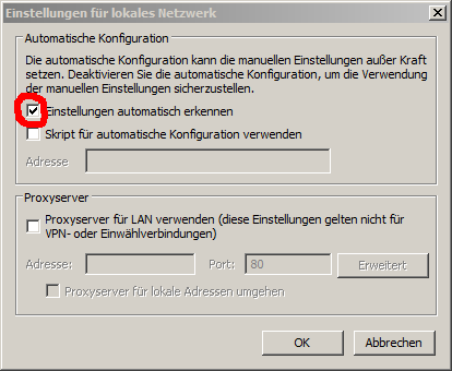 Wählen Sie unter "Extras" bzw. dem Zahnradsymbol den Punkt "Internetoptionen" und im dann erscheinenden Dialogfenster den Karteireiter "Verbindungen". Klicken Sie auf "LAN-Einstellungen". Es erscheint ein neuer Dialog "Einstellungen für lokales Netzwerk" (siehe Screenshot). Klicken Sie "Einstellungen automatisch erkennen" an.