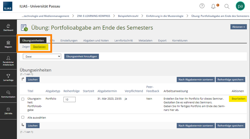 Studierende können jetzt direkt über die Übung in Ihrem Kurs ein Portfolio erstellen, bearbeiten und abgeben.