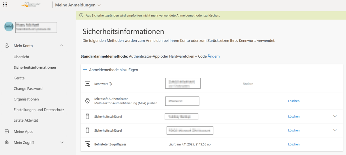 Unter „Sicherheitsinformationen“ sehen Sie Ihren neu erstellten befristeten Zugriffspass. Wenn Sie beispielsweise Ihr Mobilgerät mit den hinterlegten Authentifizierungsmethoden nicht mehr verwenden können, haben Sie hier die Möglichkeit, diese Geräte zu löschen und neue Methoden einzurichten. Anschließend können Sie den befristeten Zugriffspass wieder löschen. Der befristete Zugriffspass wird automatisch aus der Übersicht der Anmeldemethoden entfernt, nachdem dieser seine Gültigkeit verliert.