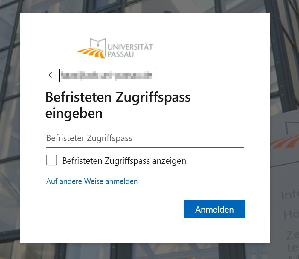 Der befristete Zugriffspass ermöglicht den vorübergehenden Zugang zum Universitäts-Konto oder zum Microsoft-Konto der Universität, ohne dass eine Bestätigung durch einen zweiten Faktor notwendig ist.