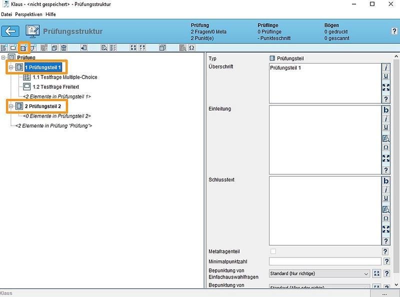 Unter "Prüfungsstruktur" erstellen Sie Ihre Prüfung - von den Prüfungsfragen, bis hin zur Struktur und der Bepunktung.
