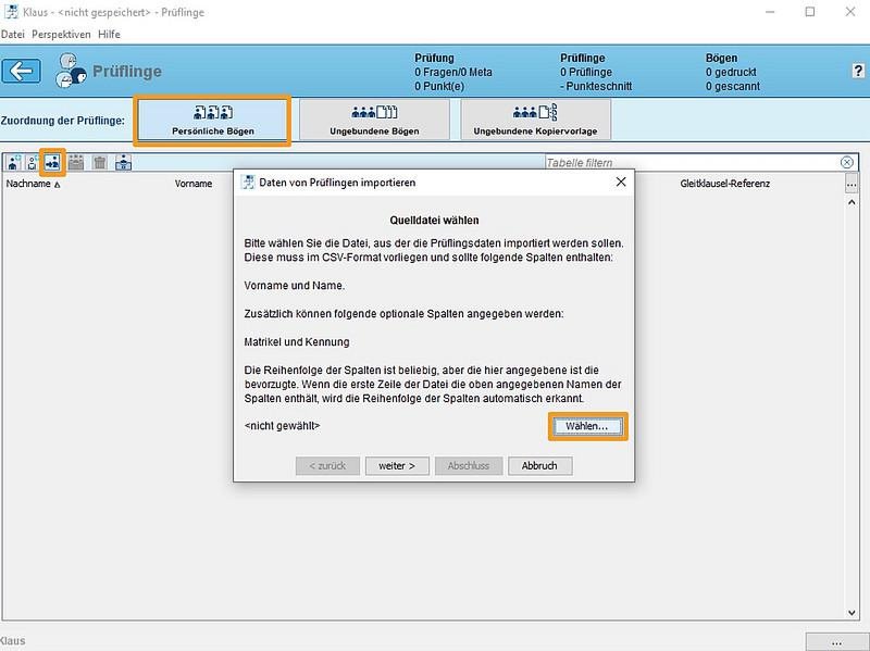 Wenn Sie die persönlichen Bögen wählen, können Sie entweder die Prüflinge direkt in Klaus anlegen, oder aus einer Quelldatei (im CSV-Format) importieren.