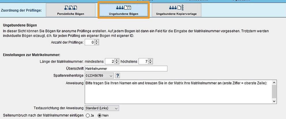 Hier können Sie entweder personengebundene Prüfungsbögen anlegen, oder ungebundene Bögen festlegen, in denen die Prüflinge dann ihre eigene Matrikelnummer eintragen.