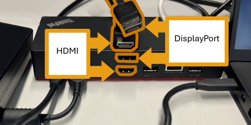 Haben Sie ein Lenovo Dienstnotebook mit Dockingstation bestellt, so erhalten Sie meist zwei Netzteile – eines mit einer höheren Wattzahl (z.B. 90W) und eines mit einer geringeren Wattzahl (z.B. 65W). Verbinden Sie das Netzteil wie rechts abgebildet mit der Dockingstation. Vergessen Sie dabei nicht, das Netzteil mit Strom zu versorgen.