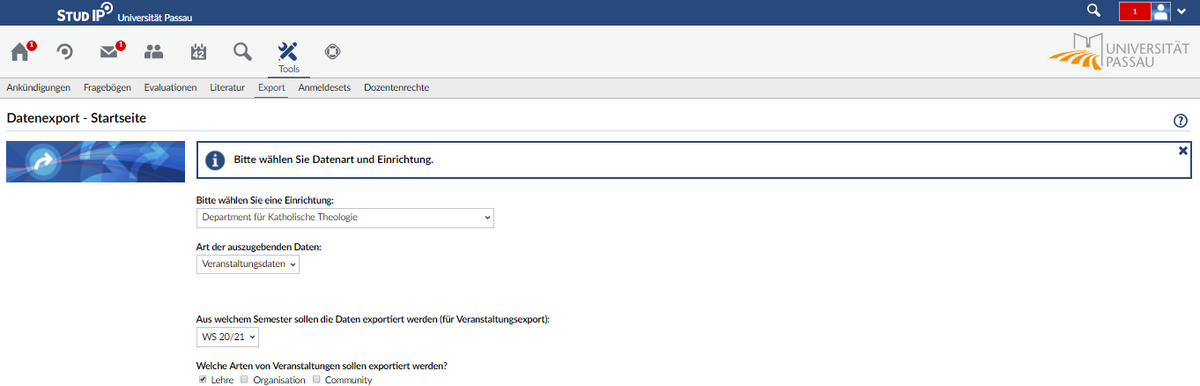 Mit dem Export-Modul können Sie sich Veranstaltungs- oder Personendaten aus der Stud.IP-Datenbank in verschiedenen Formaten exportieren lassen. So können diese Daten in ein Format gebracht werden, das in anderen Anwendungen weiterverarbeitet und gedruckt werden kann.