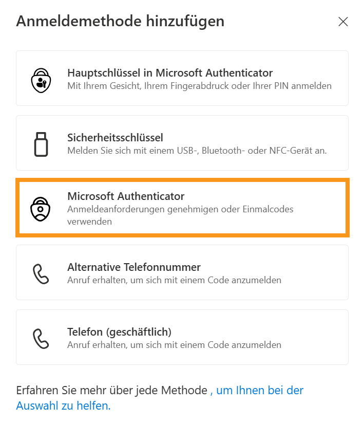Wählen Sie "Microsoft Authenticator" als neue Methode.