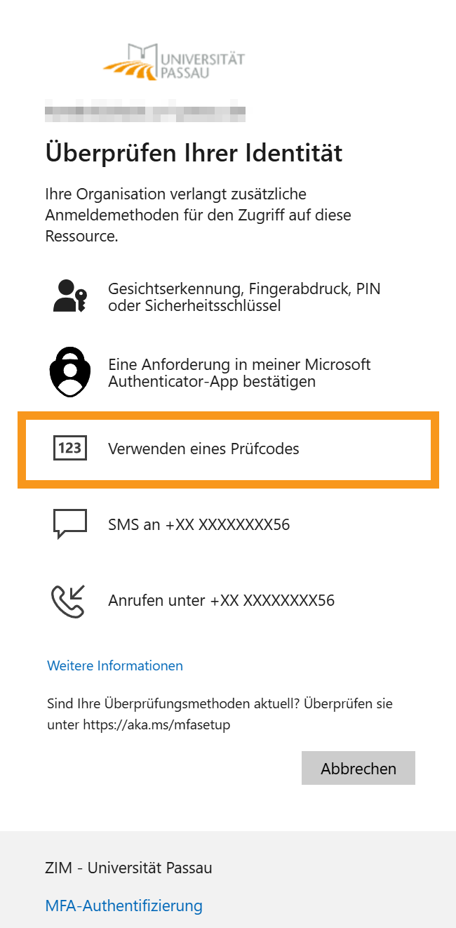 Wählen Sie „Verwenden eines Prüfcodes“ aus.