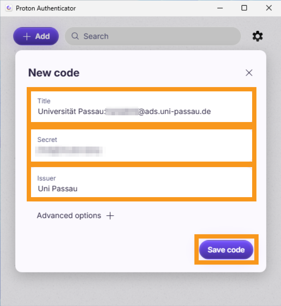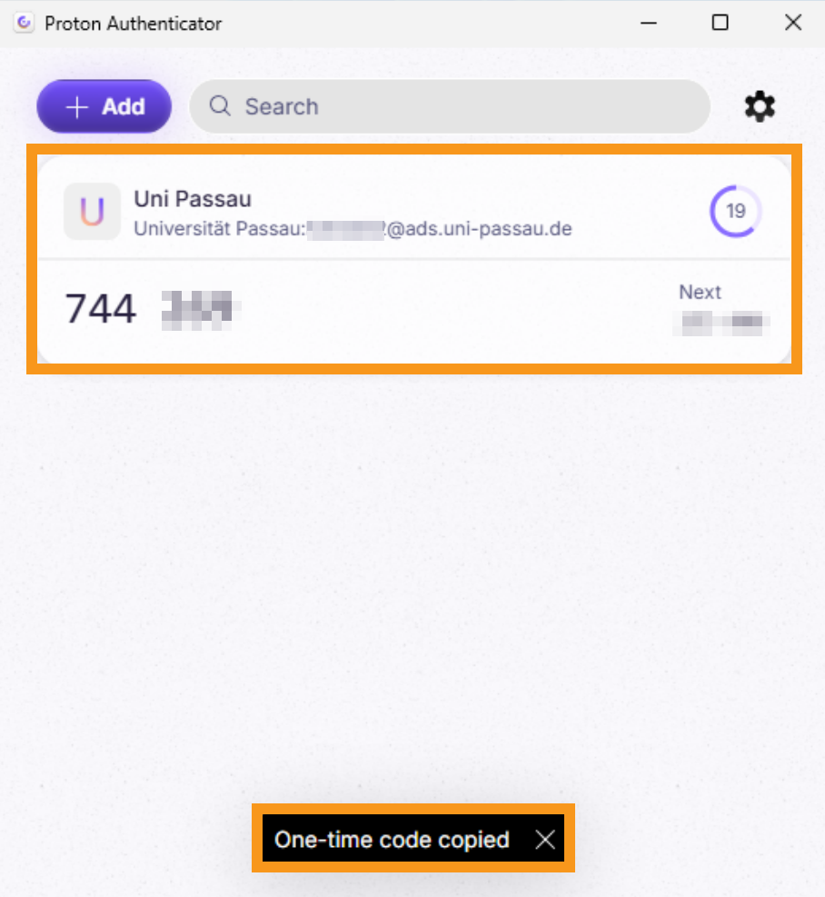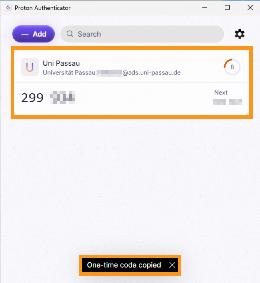 Öffnen Sie den "Proton Authenticator", wählen Sie Ihren Uni-Account und kopieren Sie den angezeigten Code.