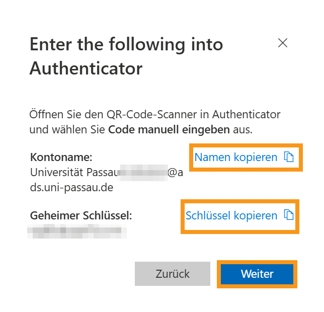 - Scannen Sie den angezeigten QR-Code mit der installierten Authenticator-App.